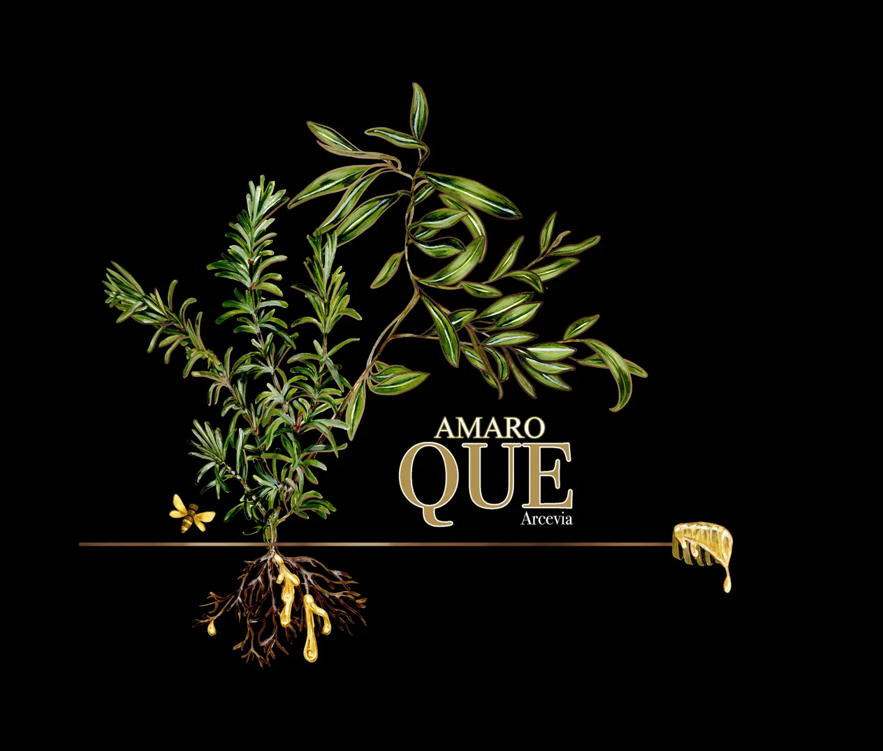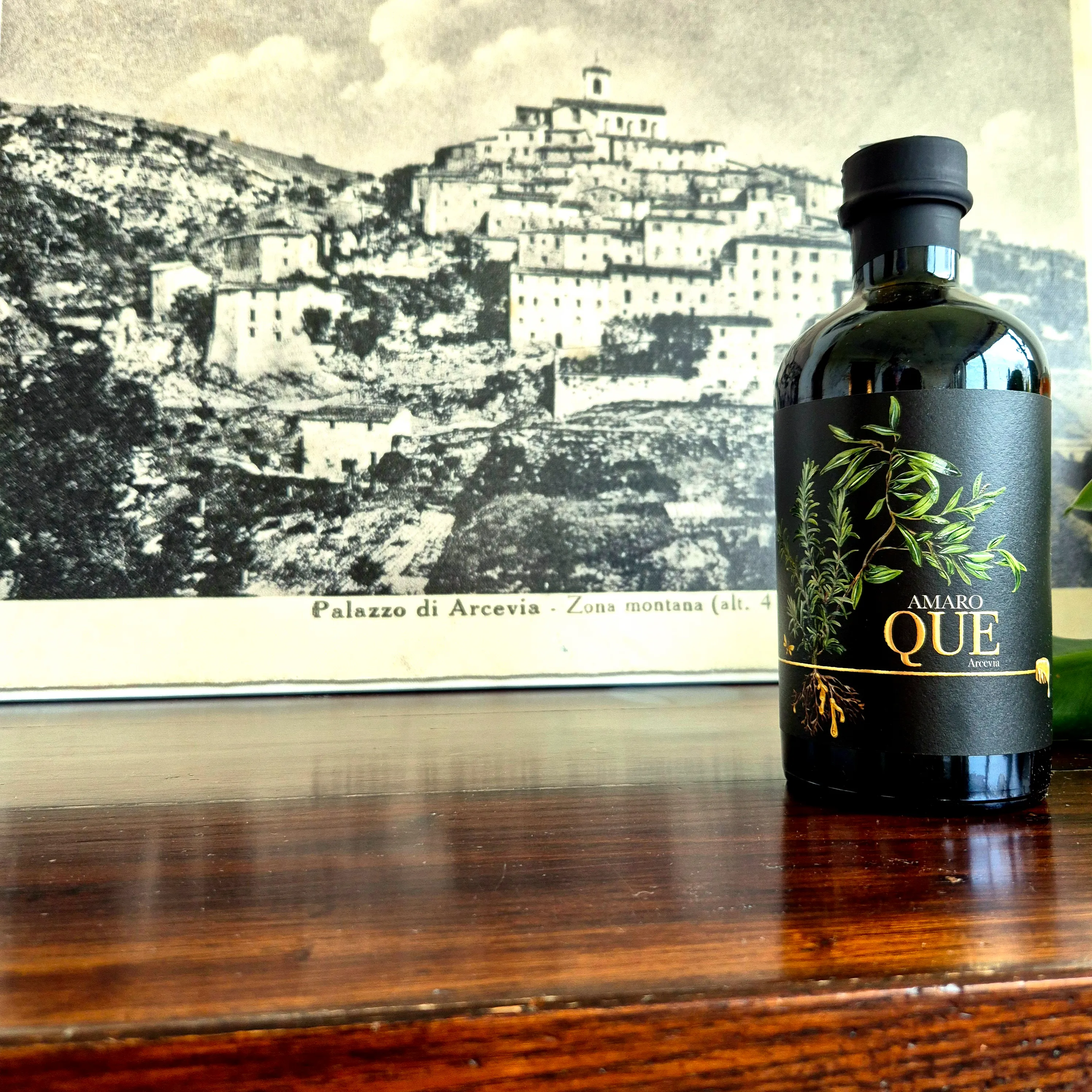 La ricetta dell’Amaro QUE è ottenuta da miscele di rosmarino, foglie di ulivo e miele. Il primo dei tre elementi dominanti risulta essere il rosmarino. Nel territorio Arceviese è presente una piccola società agricola biologica la quale puó contare su una delle coltivazioni di Rosmarino più estese della zona (pianta officinale). Dopo la raccolta dei rami nel mese di Luglio, la materia prima viene lasciata a macerare in una soluzione idroalcolica per circa 10 giorni per ottenerne un infuso; un’altra parte di rosmarino fresco viene distillato per ottenere gli olii essenziali che caratterizzano l’amaro. Il territorio collinare nella parte centrale delle Marche è caratterizzato da Ulivi e dalla presenza di frantoi, i quali tutt’ora oggi macinano come da tradizione l’oliva creando olio evo biologico. Durante la raccolta dell’oliva nel mese di Novembre vengono conservate in parte le foglie della pianta stessa, le quali successivamente vengono messe in infusione, creando la seconda essenza dell’amaro QUE. Infine, va dato lustro ad uno dei mestieri più antichi ed ancora in essere tramandato da generazioni e generazioni in famiglia; quella degli apicoltori. Diverse famiglie gestiscono arnie locate nei terreni dei nove Castelli di Arcevia trasformando il lavoro delle api in miele dorato biologico artigianale. La parte dolce di questo miele artigianale compensa in modo naturale la balsamicità di rosmarino ed ulivo e sostituisce il saccarosio normalmente aggiunto in prodotti a base alcolica. Caratteristiche bottiglia: versione 70cl, 28% vol., bottiglia con vetro riciclato e tappo in legno.