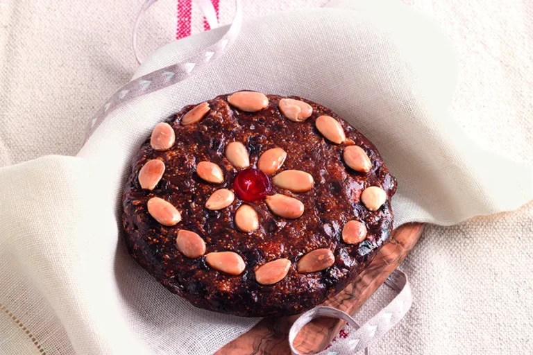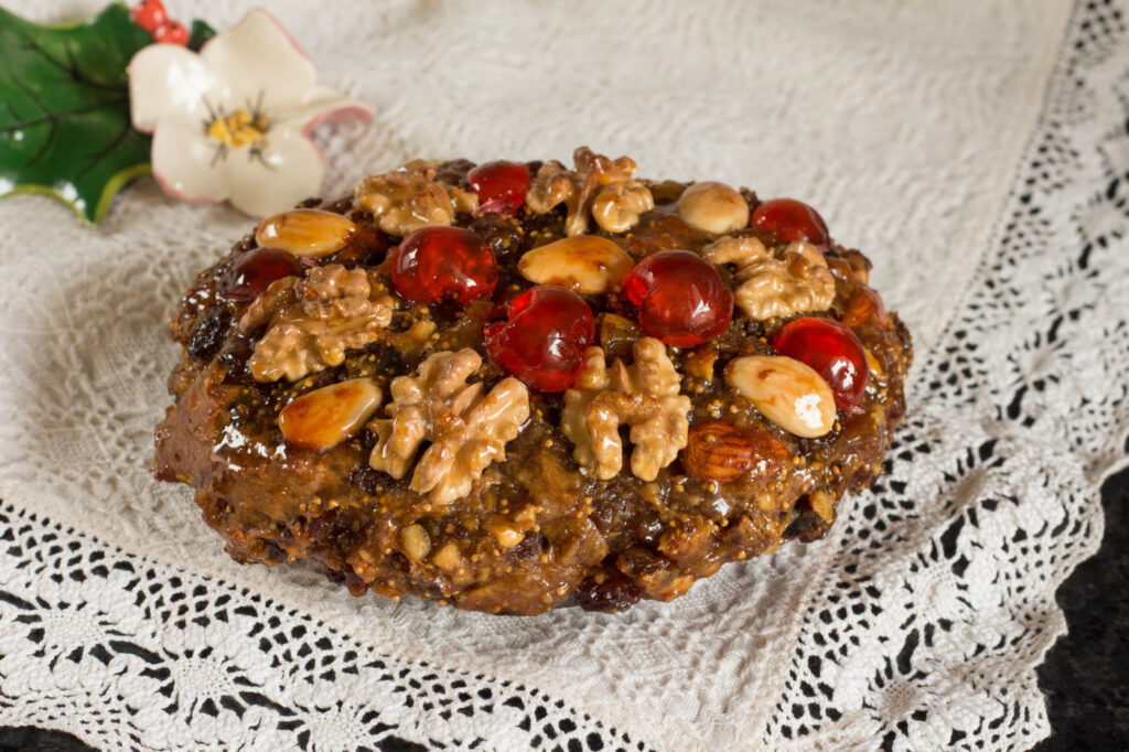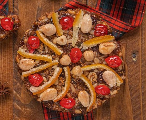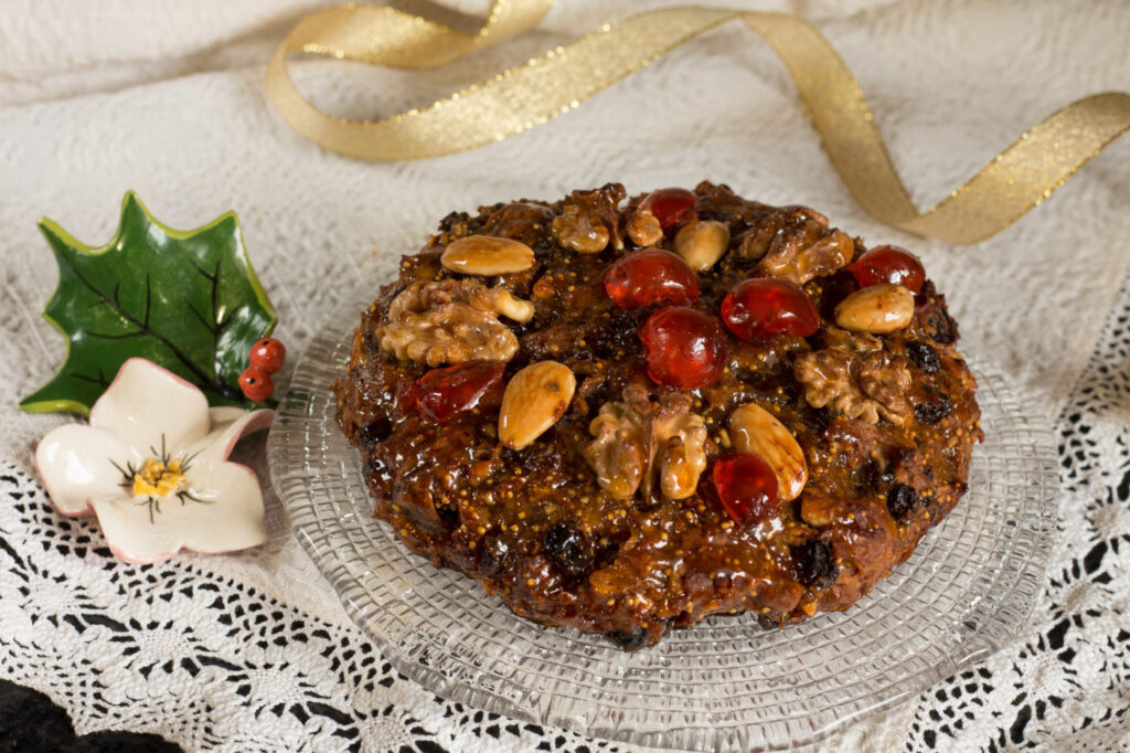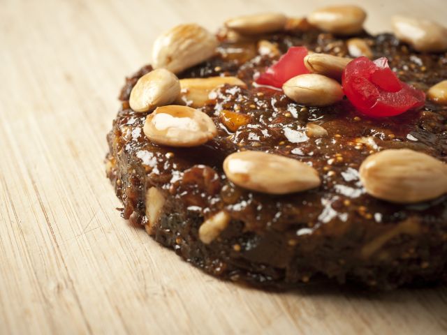 Decorare con mandorle, gherigli di noce e ciliegie candite.